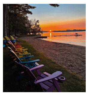 Lawn chairs on grass near beach and lake in St. Germain, Wisconsin